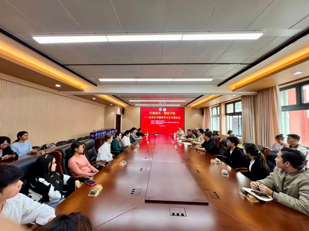 月满国庆,情浓中秋。2025年9月30日,云南师范大学华文学院联合昆明市对外经济技术合作协会(呈贡区外籍人才服务工作站)、呈贡区政府、中通国际东南亚公司,共同举办呈贡区外籍留学生双节茶话会。来自孟加拉、柬埔寨、印度、吉尔吉斯斯坦、老挝、缅甸、斯里兰卡、泰国、乌克兰、越南等国的22名来华留学生欢聚一堂,在中秋与国庆双节相逢之际共话文化、畅叙情谊,畅谈在校学习感受,分享个人想法,亲身感受中国传统节日的温馨氛围与独特魅力。