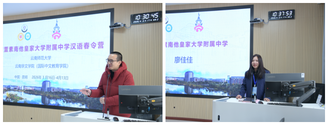 3月17日上午,2026年泰国萱素南他皇家大学附属中学汉语春令营开营仪式在云南师范大学呈贡校区云南华文学院(国际中文教育学院)举行。云南华文学院(国际中文教育学院)副院长戴思远、泰国萱素南他皇家大学附属中学外语系主任MISS MAYCHAYA LEAWBOONGIM(廖佳佳)、基地办工作人员及全体营员参加了开营仪式。