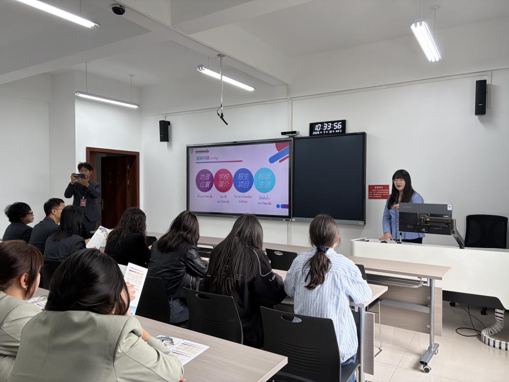 4月10日上午,招生大使王玉菲同学继续在学院为到访的泰国东方大学附属中学22名学生及带队教师进行泰语现场宣讲,进一步加深了师生对学院办学条件与招生政策的直观了解。
